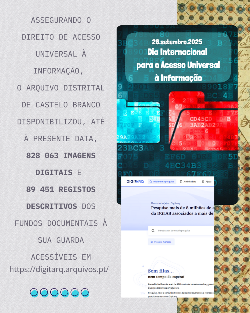Assegurando o direito de acesso universal à informação, o Arquivo Distrital de Castelo Branco disponibilizou, até à presente data, 828 063 imagens digitais e 89 451 registos descritivos dos fundos documentais à sua guarda.