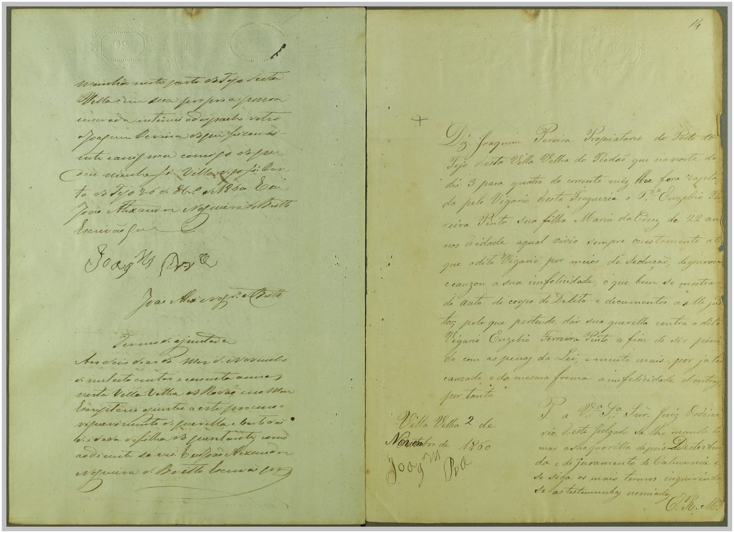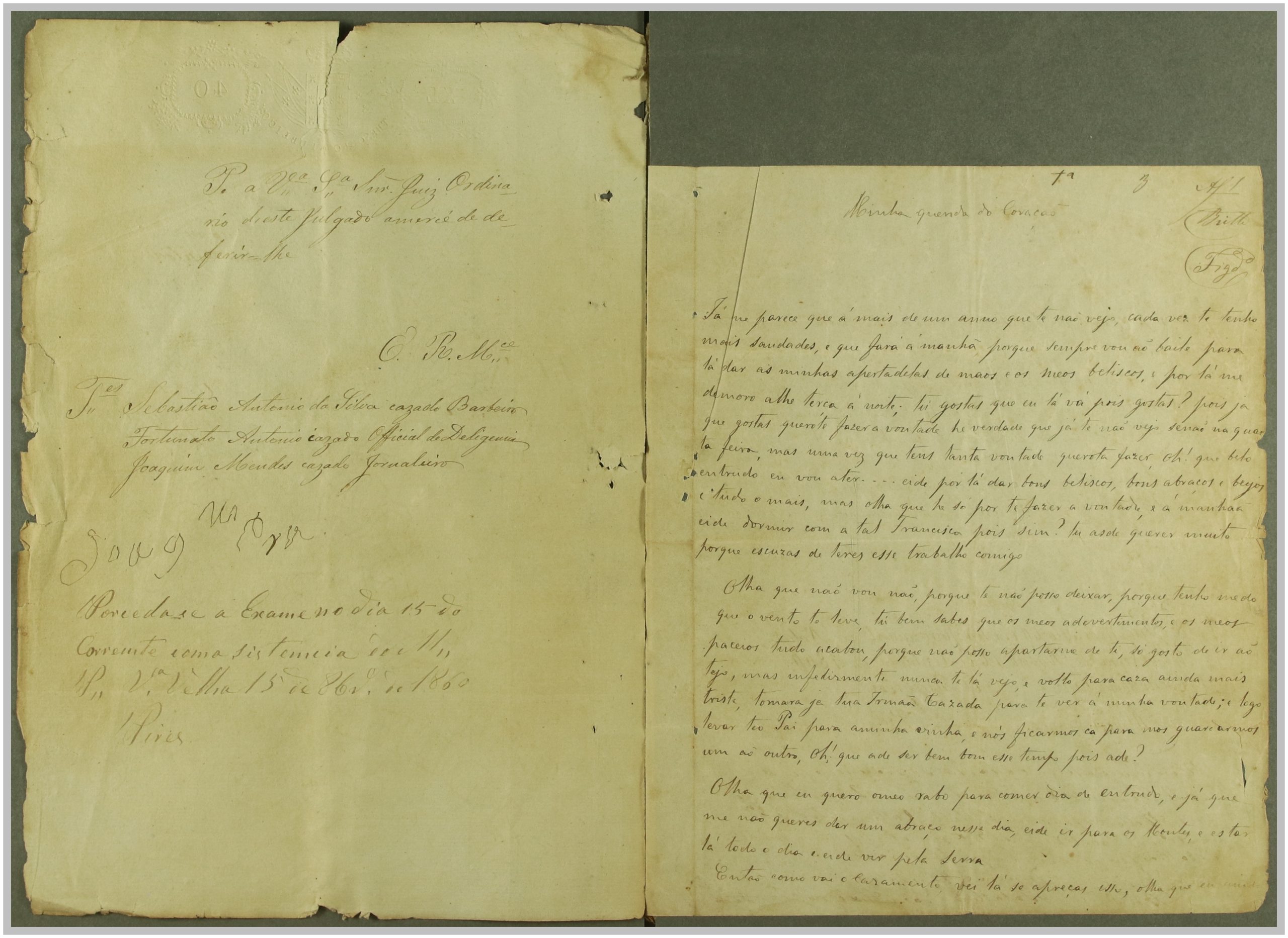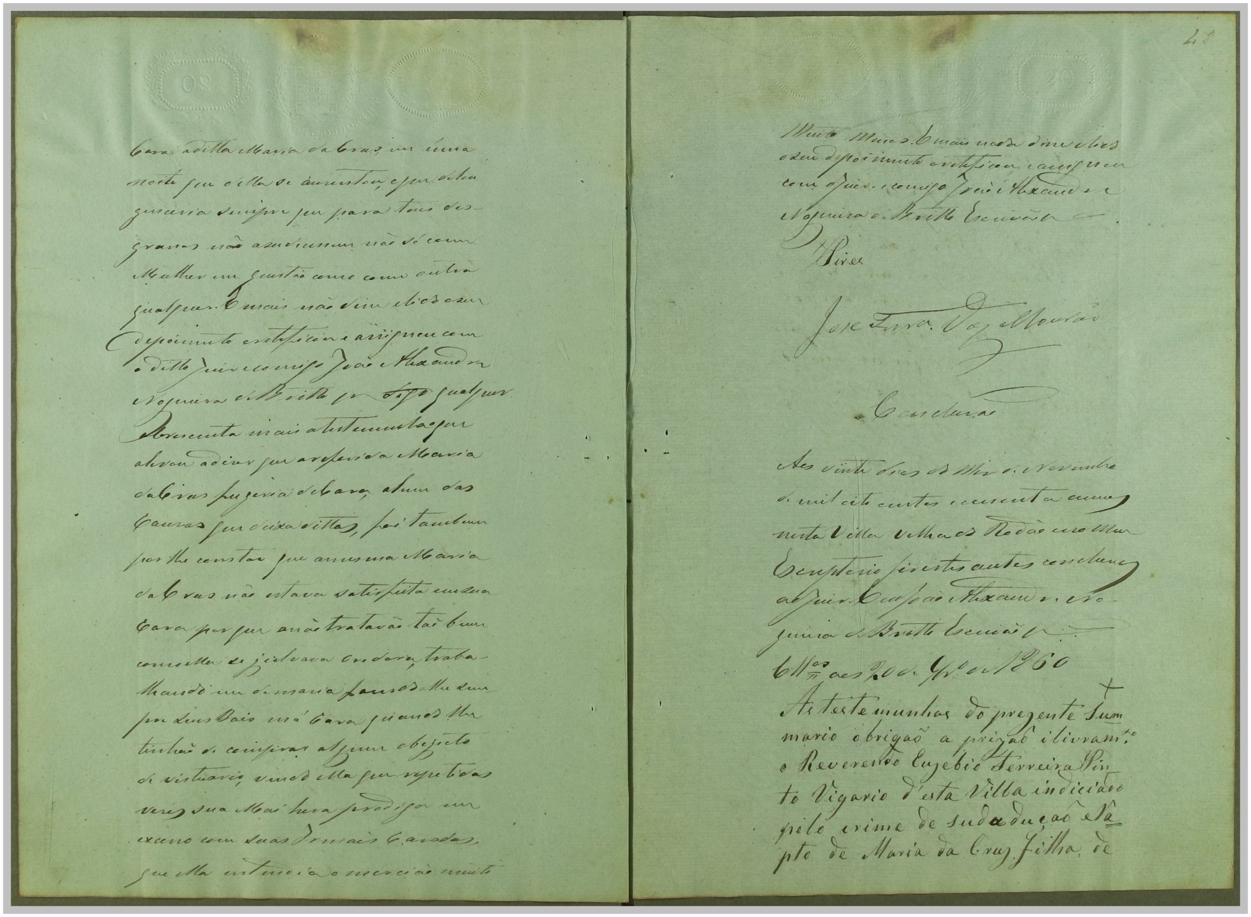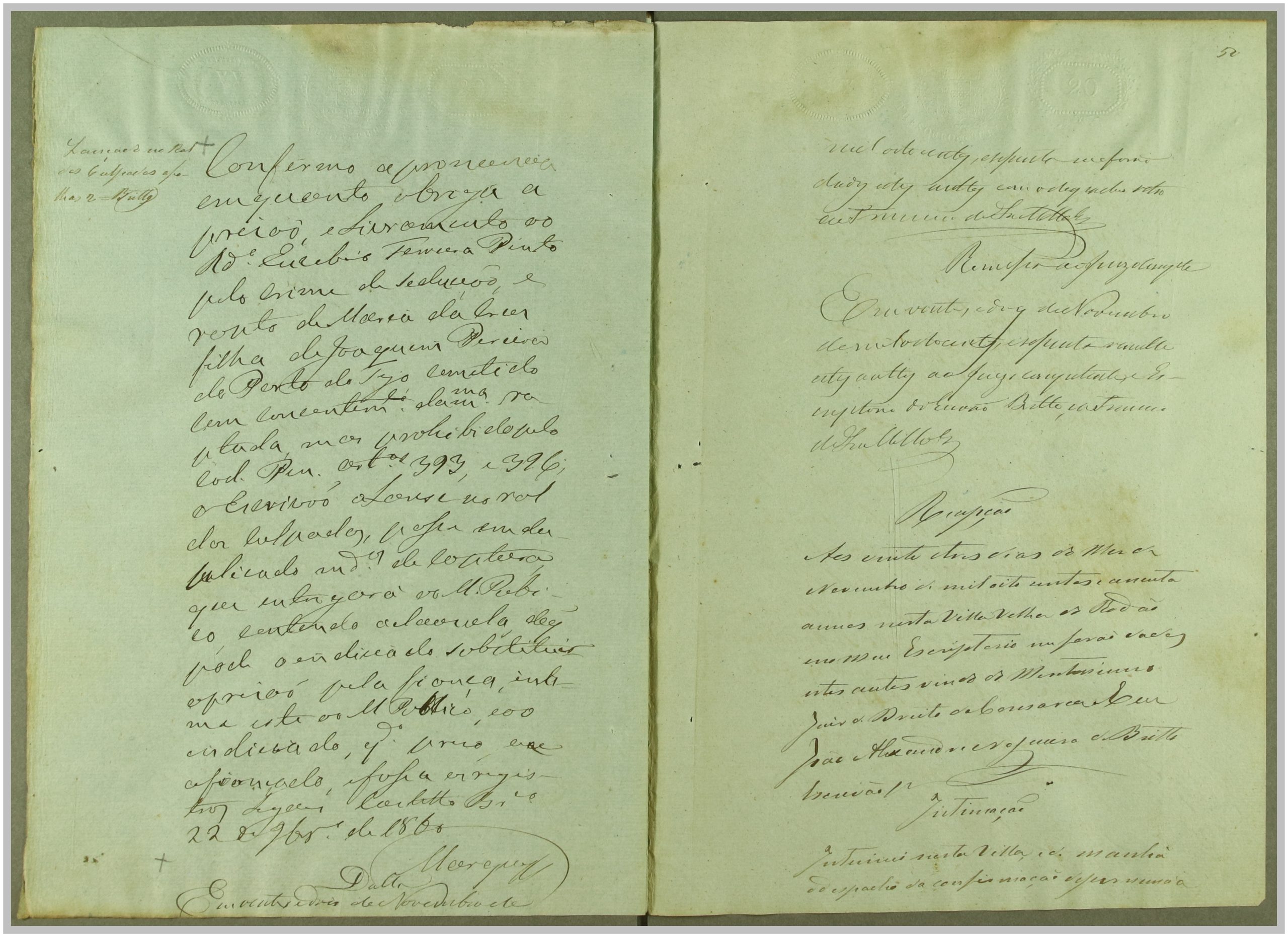Processo “Autos crimes de Rapto” em que o réu Reverendo Euzebio Ferreira Pinto foi acusado pelo crime de sedução e rapto de Maria da Cruz, com consentimento da mesma, mas punido pelo Código Penal em 1860. Através do exame de corpo de delito às cartas trocadas, que fazem parte integrante do processo, e à inquirição das testemunhas, foi o réu condenado a prisão e livramento; após a condenação, o autor Joaquim Pereira, pai da raptada, apresentou desistência do processo.