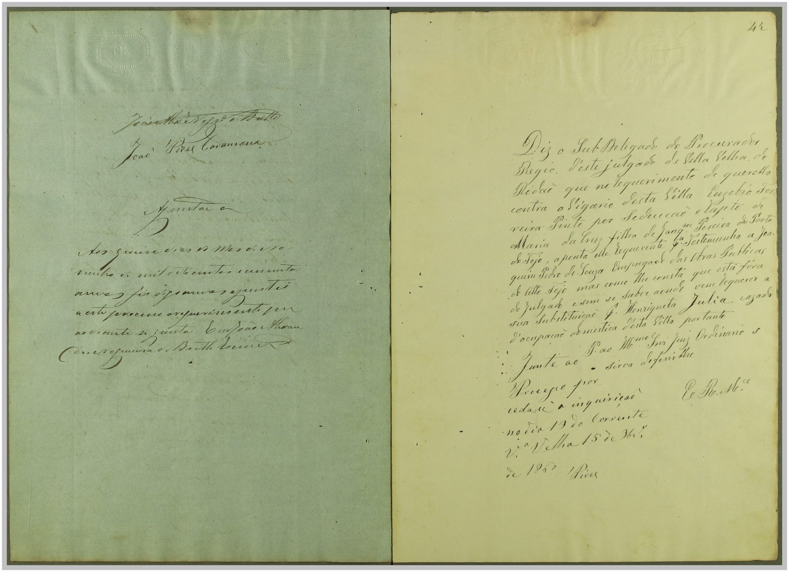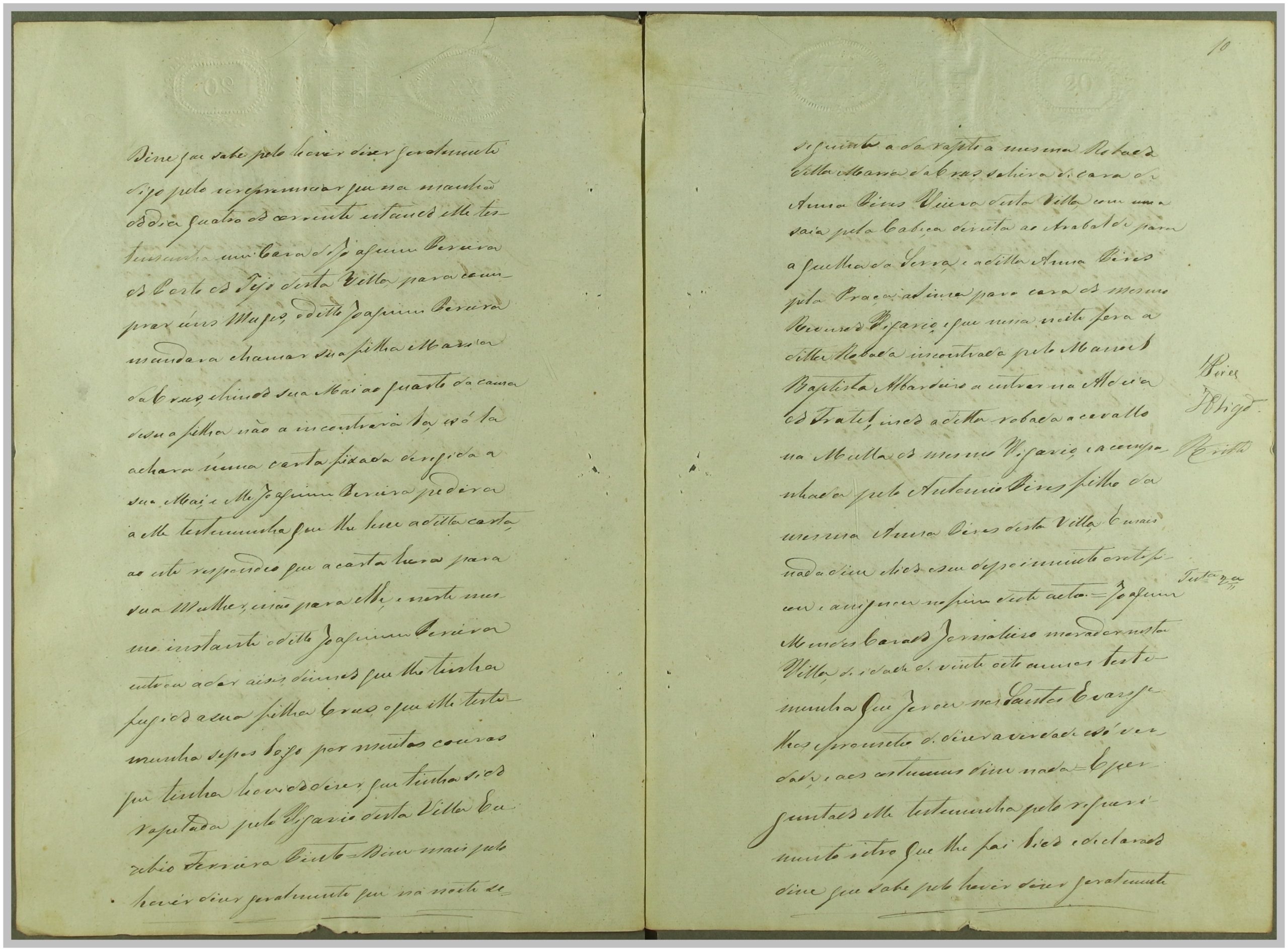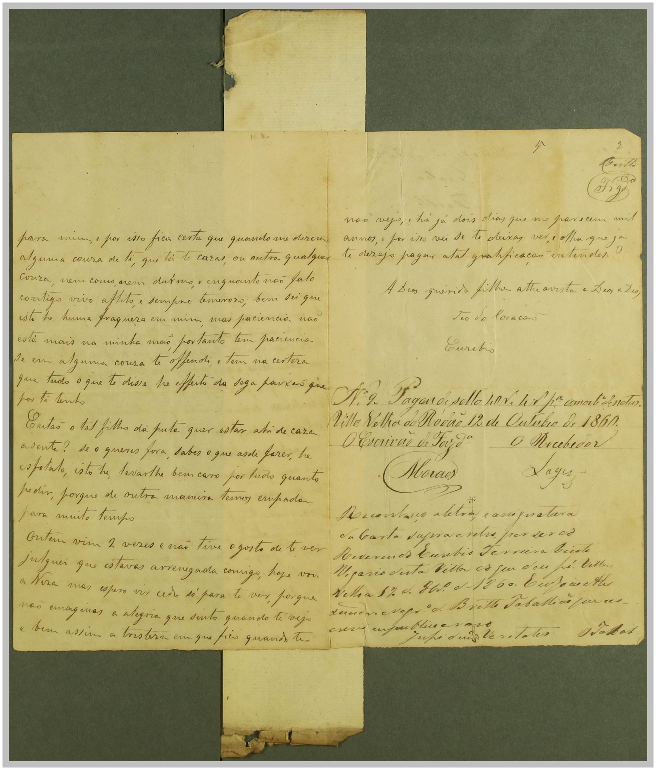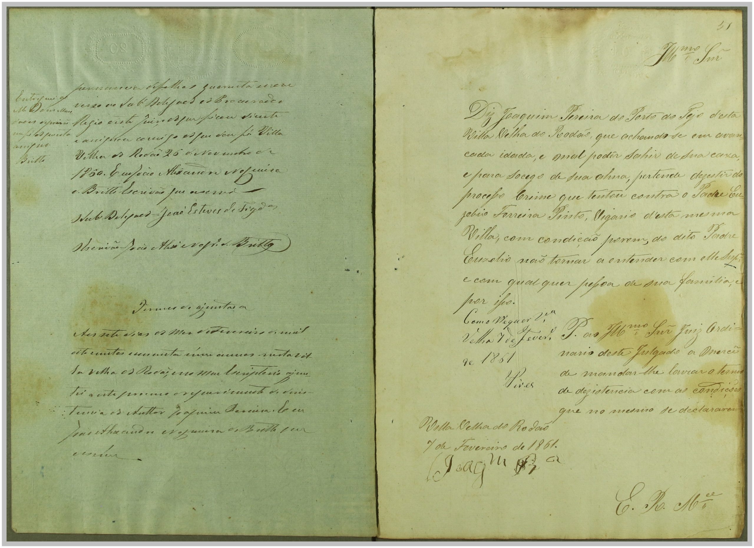 Processo “Autos crimes de Rapto” em que o réu Reverendo Euzebio Ferreira Pinto foi acusado pelo crime de sedução e rapto de Maria da Cruz, com consentimento da mesma, mas punido pelo Código Penal em 1860. Através do exame de corpo de delito às cartas trocadas, que fazem parte integrante do processo, e à inquirição das testemunhas, foi o réu condenado a prisão e livramento; após a condenação, o autor Joaquim Pereira, pai da raptada, apresentou desistência do processo.