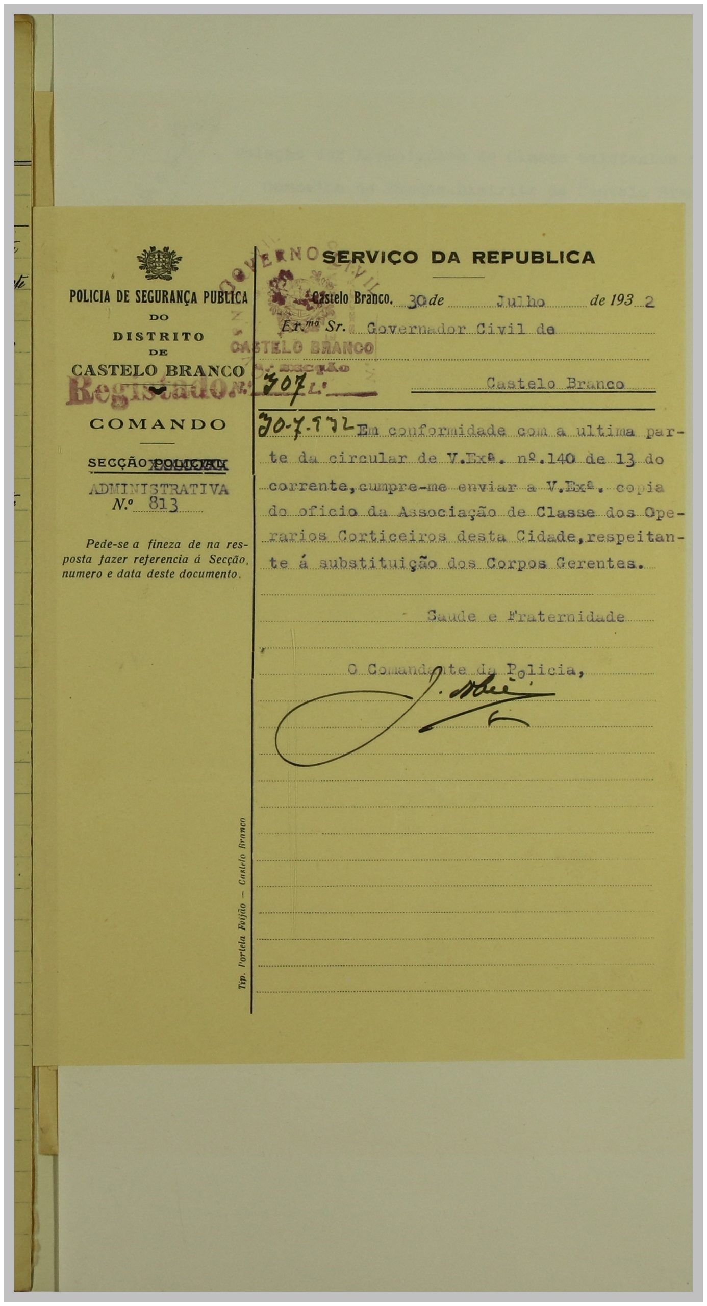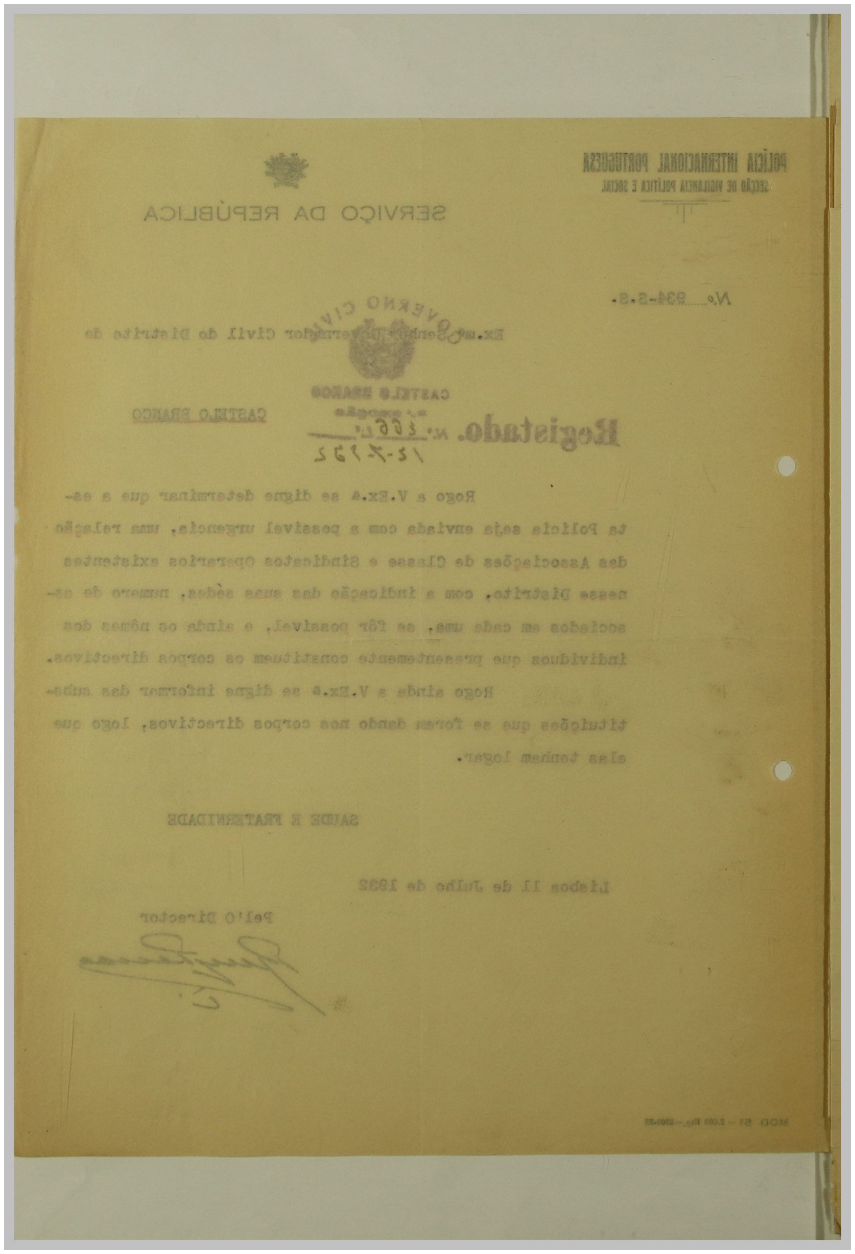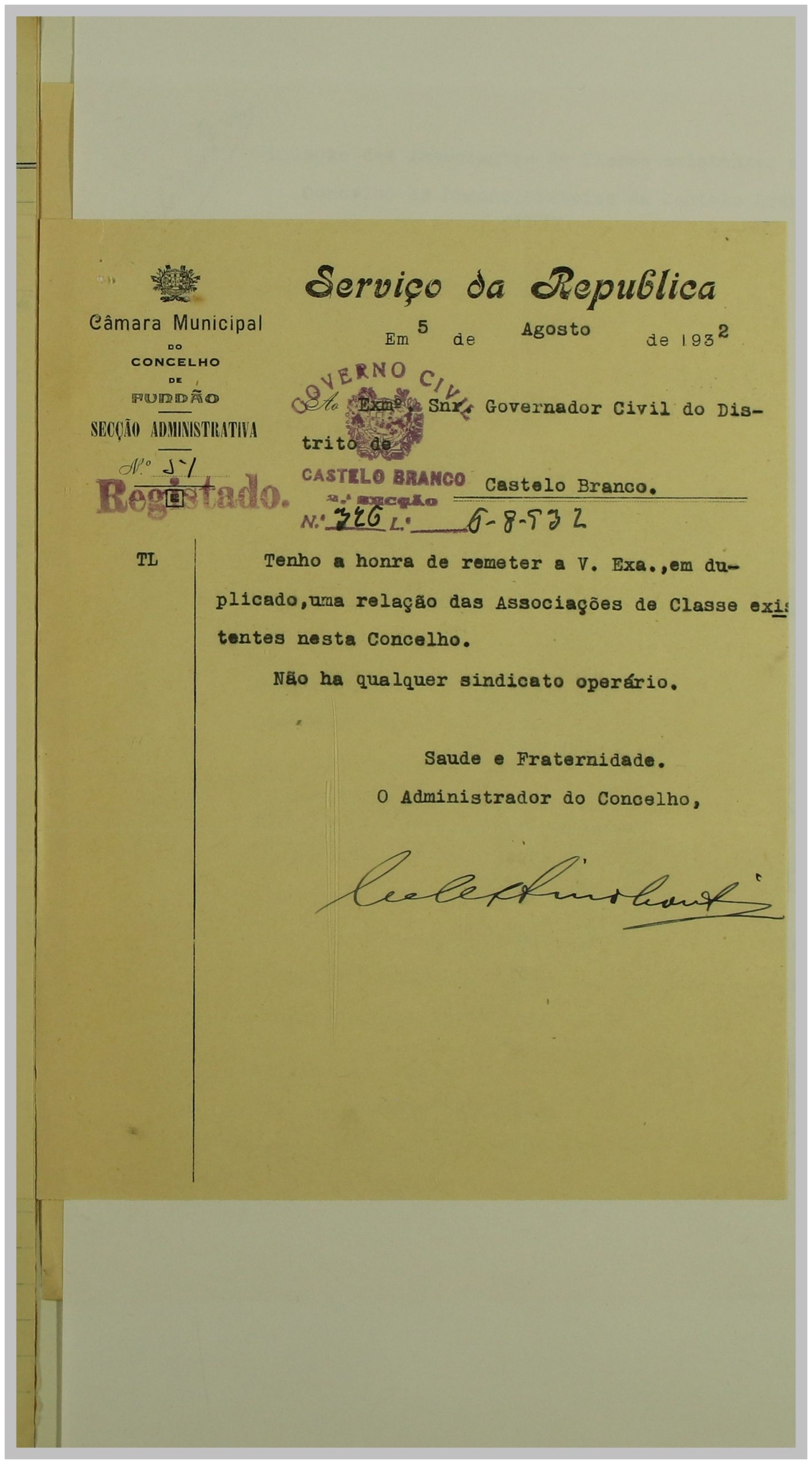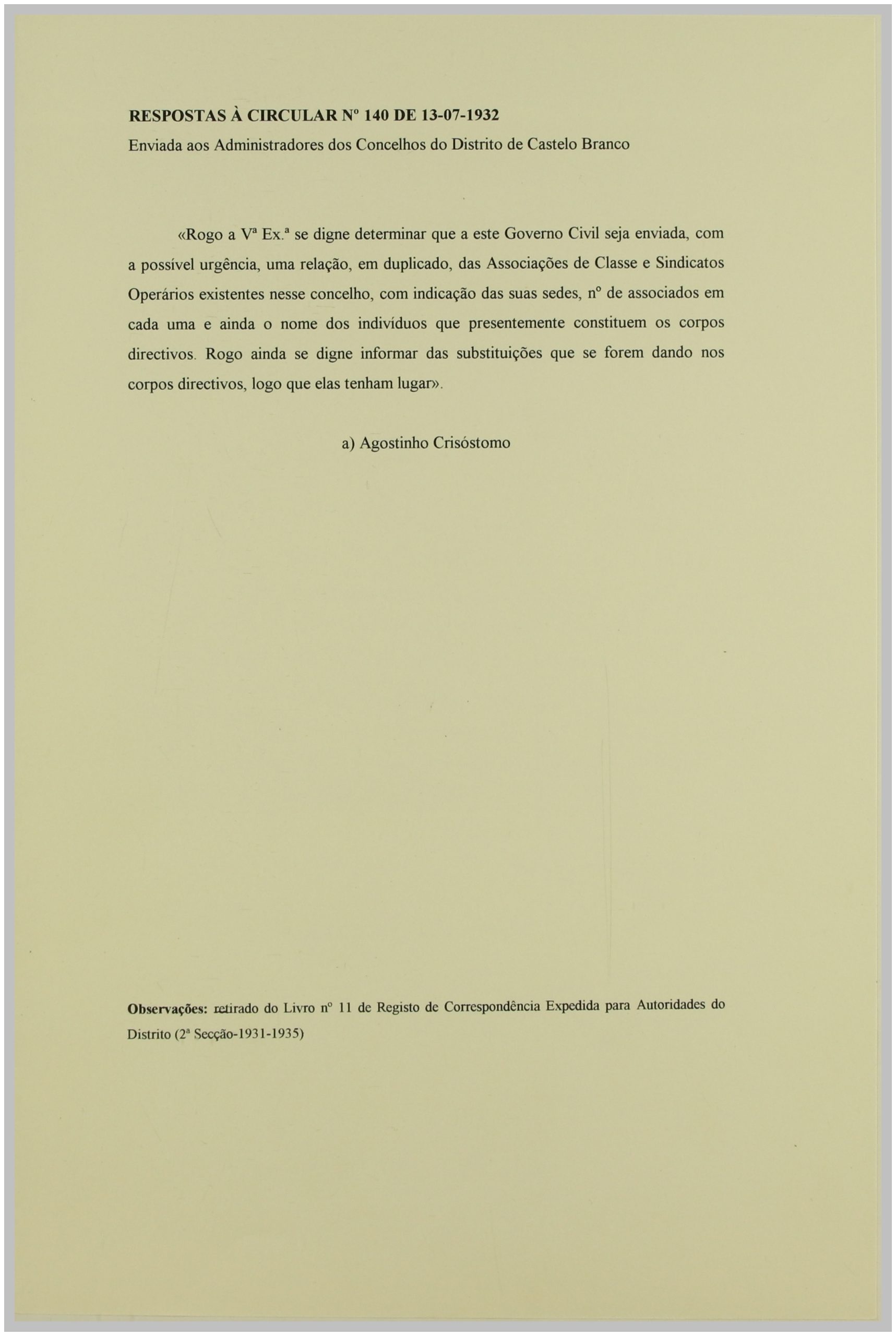 É neste contexto que a Secção de Vigilância Política e Social da Polícia Internacional Portuguesa dirige uma circular ao Governo Civil, solicitando a relação das Associações de Classe e Sindicatos Operários existentes no distrito de Castelo Branco. As respostas a esta circular constituem um importante registo do movimento associativo e sindical da época nesta região.
